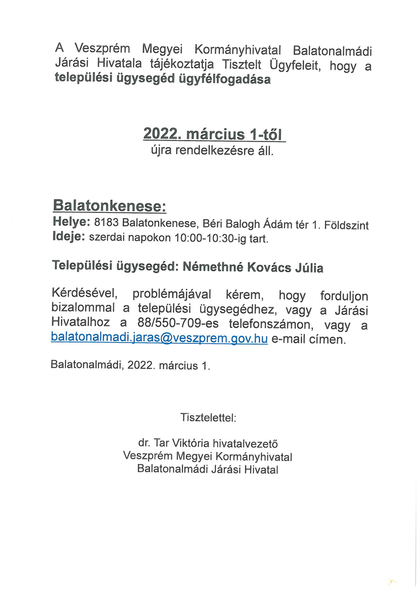 A települési ügysegéd ügyfélfogadása 2022. március 1. naptól szerdai napokon 10:00-10:30 között a Balatonkenesei Polgármesteri Hivatalban újra rendelkezésre áll.