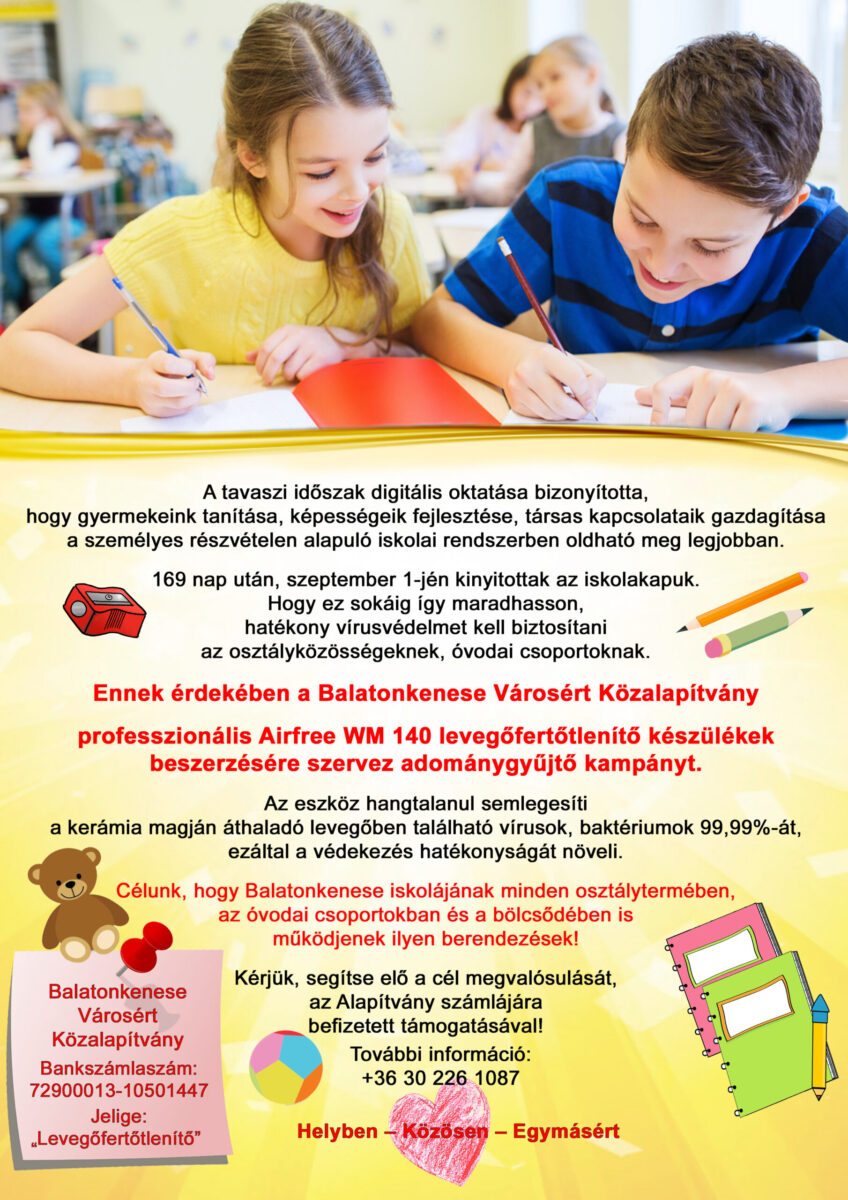 Balatonkenese Városért Közalapítvány adománygyűjtő kampányt szervez. Az adománygyűjtés célja, hogy a Közalapítvány légfertőtlenítő készülékeket tudjon vásárolni az Iskola, Óvoda és Bölcsőde részére. Kérjük és várjuk megtisztelő adományaikat az Alapítvány számlájára: 72900013-10501447