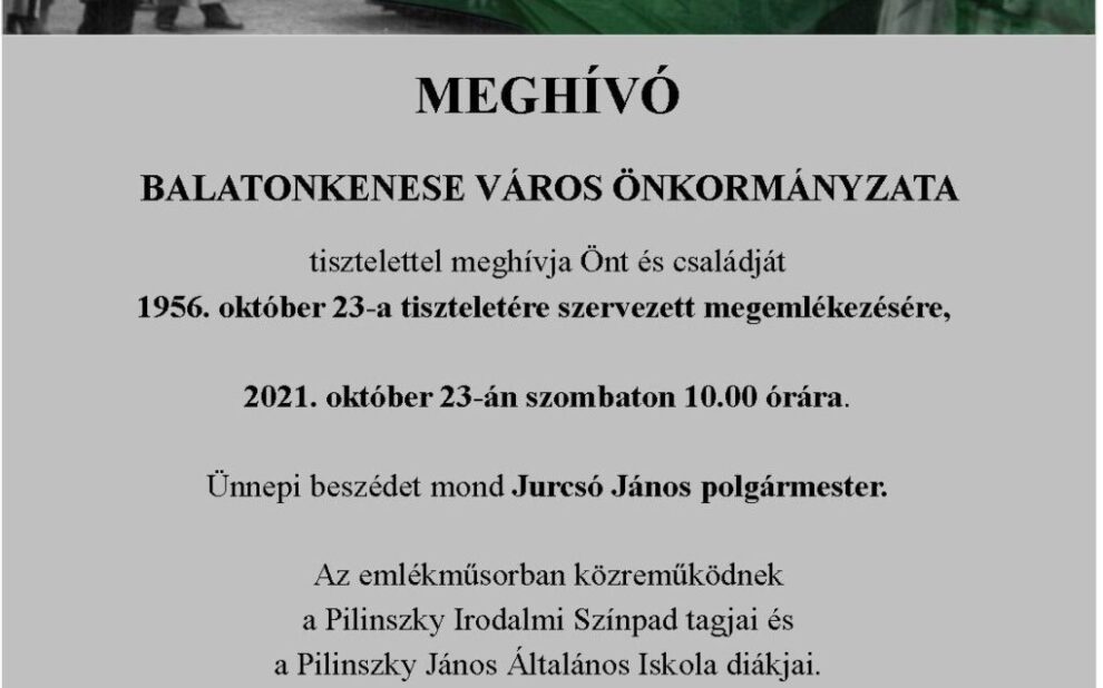 Balatonkenese Város Önkormányzata és a Közművelődési Intézmény és Könyvtár tisztelettel meghívja Önt és családját 1956. október 23-a tiszteletére tartandó megemlékezésre…
