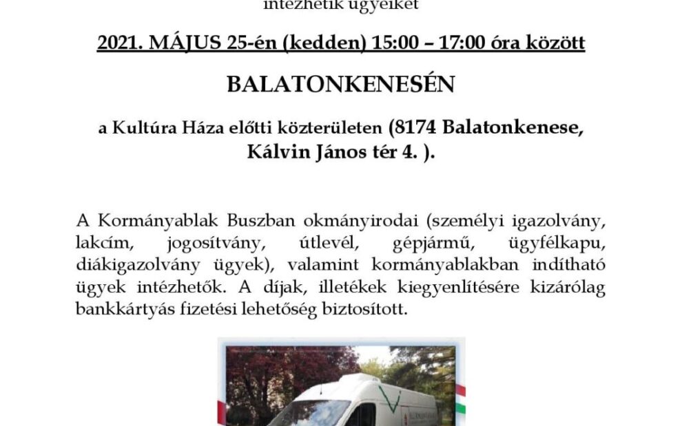 2021. május 25-én 15:00-17:00 óra között az érintettek a Kultúra Háza parkolójában álló Kormányablak buszban (mobil ügyfélszolgálat) intézhetik ügyeiket.