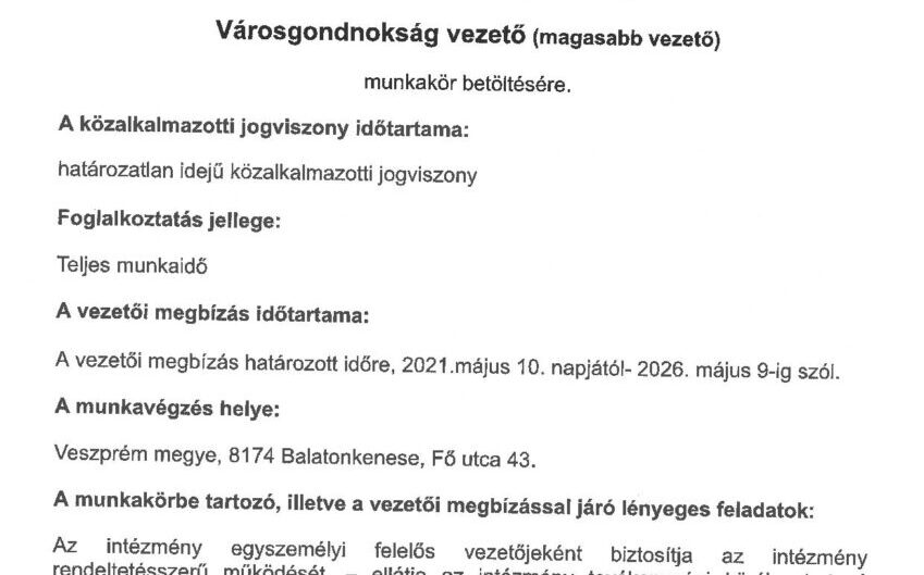 Balatonkenese Város Önkormányzata pályázatot hirdet Városgondnokság vezető (magasabb vezető) betöltésére. A vezetői megbízás határozott időre, 2021. május 10 – 2026.…