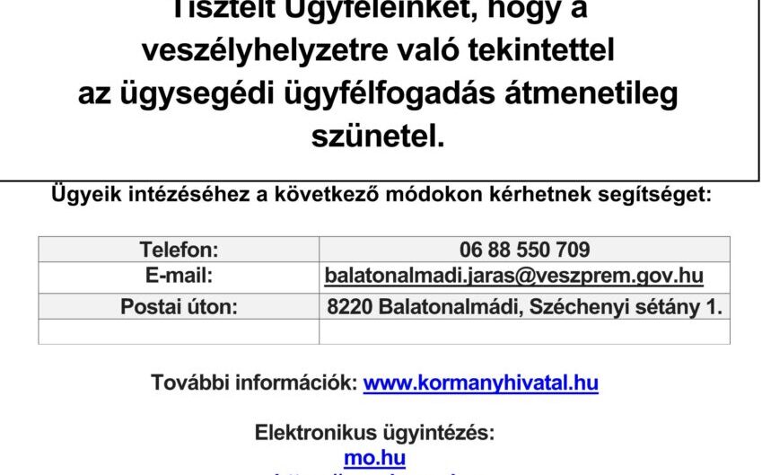A Balatonalmádi Járási Hivatal tájékoztatása alapján a települési ügysegédi fogadóórák felfüggesztésre kerülnek visszavonásig a járványügyi helyzetre való tekintettel. Az…
