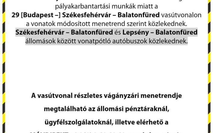 A MÁV-START Zrt. tájékoztatása szerint 2020. január 15-től 2020. április 30-ig a Szabadbattyán – Balatonfüred állomások között végzett pályakarbantartási munkák miatt Székesfehérvár –…