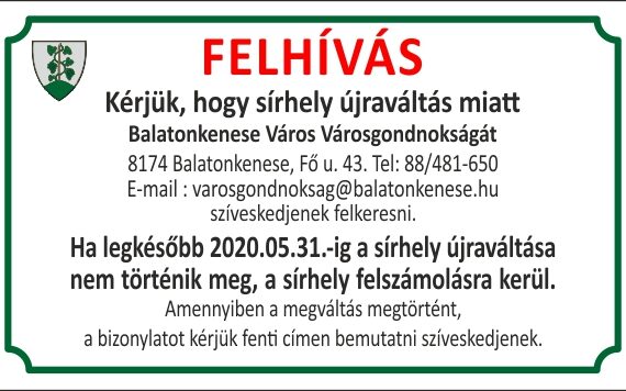 A sírhelyek újraváltásának határideje 2020. május 31-én lejár. Kérjük, ellenőrizzék, hogy megtörtént-e az újraváltás, és amennyiben nem, akkor forduljanak a…