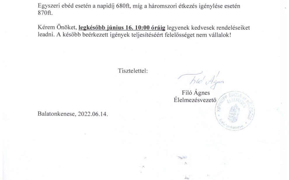 Tájékoztatjuk Önöket, hogy a nyári felügyeletet igénylő iskolások részére elérhető az étkezés 2022. június 20. és 2022. június 30. között.…