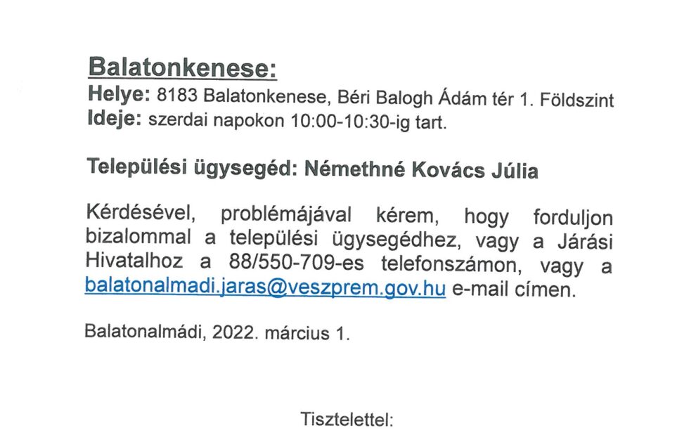 Települési ügysegéd A települési ügysegéd ügyfélfogadása 2022. március 1. naptól szerdai napokon 10:00-10:30 között a Balatonkenesei Polgármesteri Hivatalban újra rendelkezésre…