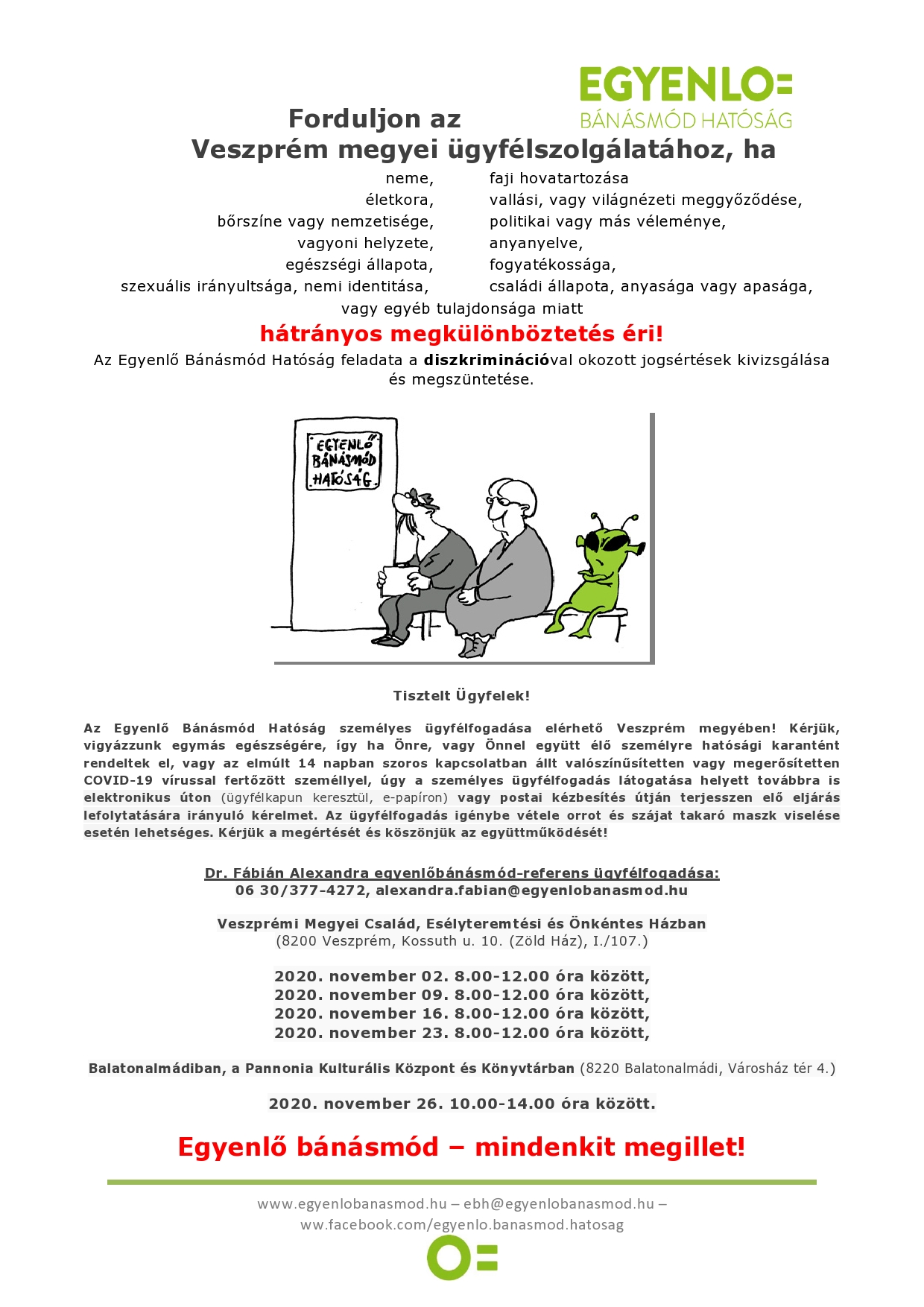 Az Egyenlő Bánásmód Hatóság személyes ügyfélfogadása elérhető Veszprém megyében!