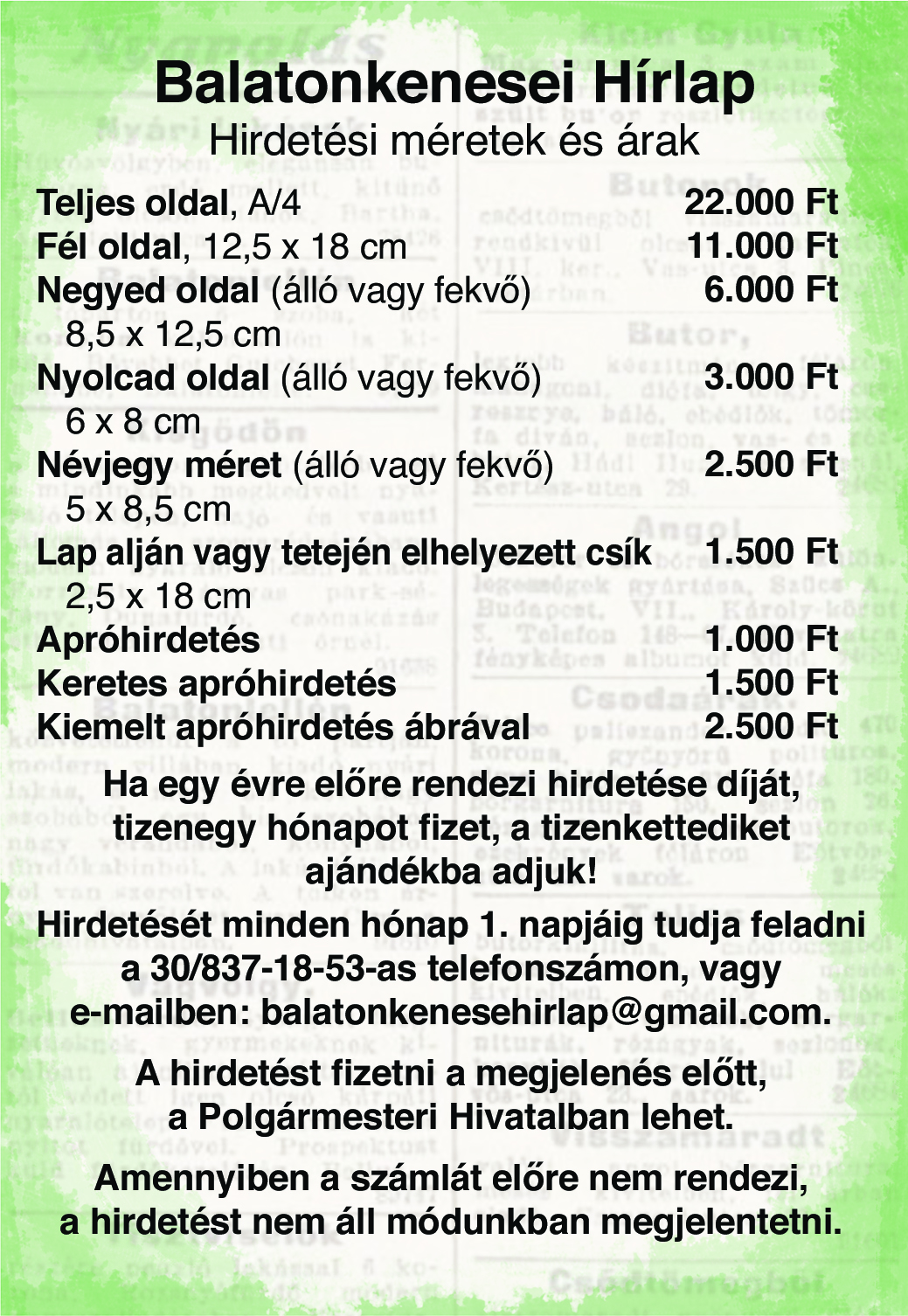 Balatonkenesei Hírlap telefon: 30/837-1853