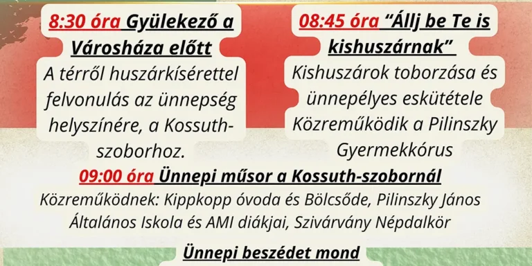 Március 15-én, 8:30 órától – Kossuth-tér Március 15 – Ünnepi megemlékezés, kis huszárok toborzása, eskütétele. Ünnepeljünk közösen!