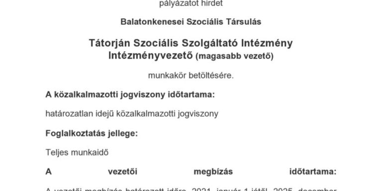 Balatonkenesei Szociális Társulás a Közalkalmazottak jogállásáról szóló 1992. évi XXXIII. törvény 20/A. § alapján pályázatot hirdet Balatonkenesei Szociális Társulás Tátorján Szociális Szolgáltató Intézmény Intézményvezető (magasabb vezető) munkakör betöltésére.   A…