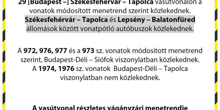 Március 17. és március 20. között vonatpótló autóbuszok közlekednek Székesfehérvár -Tapolca és Lepsény-. Balatonfüred állomások között. A részletek megtalálhatók a MÁV Zrt. elérhetőségein.