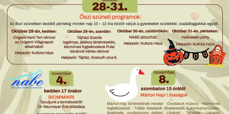 November 8-án a NABE helyi csoportja jóvoltából a Márton-nap hagyományai elevenednek meg. Óvodások műsora, játékos feladatok és jófajta ételek kóstolója.
