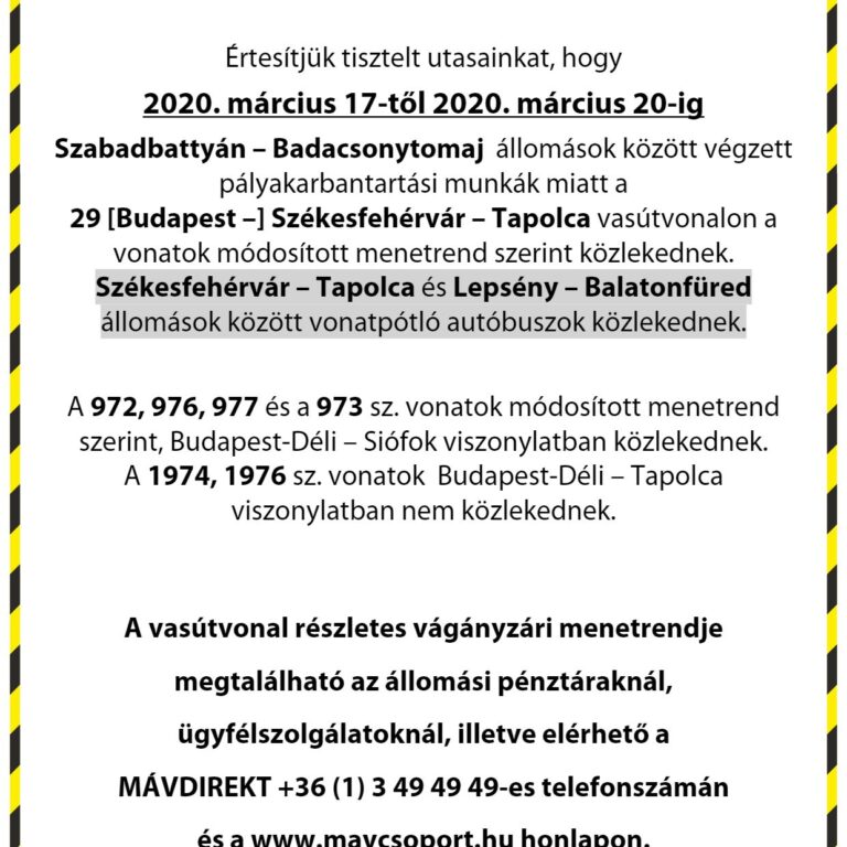 Március 17. és március 20. között vonatpótló autóbuszok közlekednek Székesfehérvár -Tapolca és Lepsény-. Balatonfüred állomások között. A részletek megtalálhatók a MÁV Zrt. elérhetőségein.