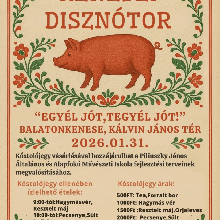 Ismét megrendezzük a hagyományos disznóvágást a Kultúra Háza előtti téren a Balatonkenesei Városvédő Egyesülettel közreműködve. A program jótékony célt szolgál, tehát a finom falatok megvásárlásával segítünk is! Várunk mindenkit szeretettel!