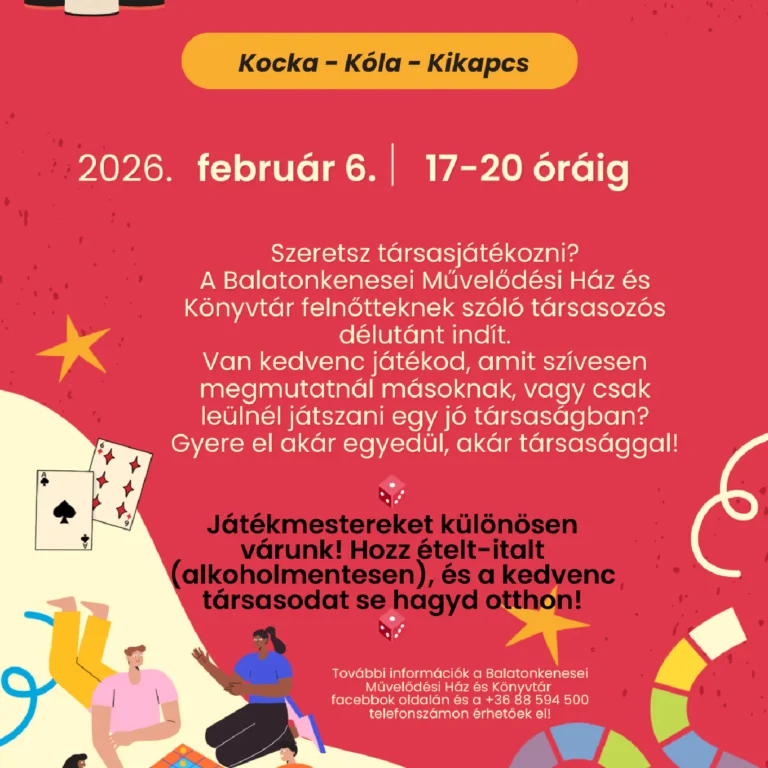 Kocka, kóla, kikapcs…Társasjátékozni még a felnőttek is szeretnek! Várunk február 6-án délután, ha vágysz egy kis közösségre és szívesen játszol együtt másokkal!