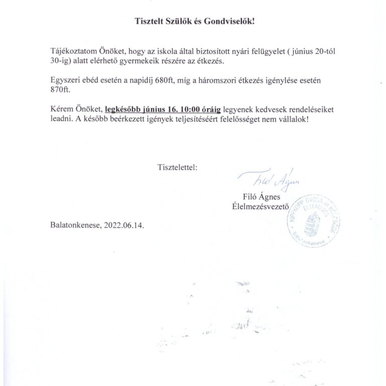 Tájékoztatjuk Önöket, hogy a nyári felügyeletet igénylő iskolások részére elérhető az étkezés 2022. június 20. és 2022. június 30. között. Rendelés leadási határidő: 2022. június 16.