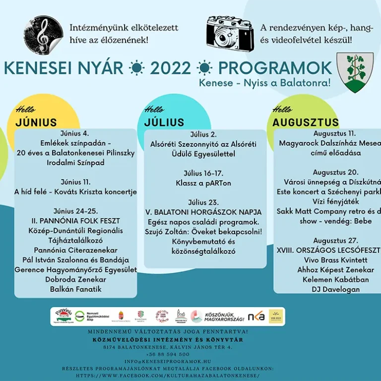 Sok szeretettel várunk minden kedves Balatonkeneseit, Balatonkenesén Nyaralót, Átutazót, Szomszédot, Érdeklődőt rendezvényeinken. A rendezvényekhez bármilyen formában hozzájáruló Partnereinknek ezúton is köszönjük az együttműködést, a közreműködést, a közös munkát, a támogatást!…