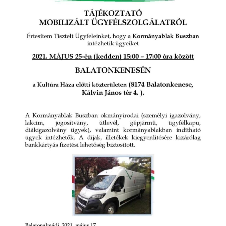 2021. május 25-én 15:00-17:00 óra között az érintettek a Kultúra Háza parkolójában álló Kormányablak buszban (mobil ügyfélszolgálat) intézhetik ügyeiket.