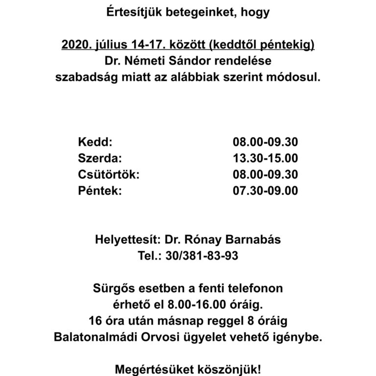 Tisztelt Kenesei Polgárok, Nyaralók! Dr. Németi Sándor e heti rendelése szabadság miatt változik. A helyettesítő orvos Dr. Rónay Barnabás az alábbi időpontokban várja a betegeket! Kedd: 8.00-9.30 Szerda: 13.30-15.00 Csütörtök:…