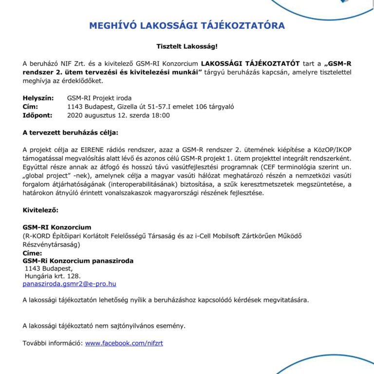 NIF Nemzeti Infrastruktúra Fejlesztő Zrt és GSM-RI Konzorcium LAKOSSÁGI TÁJÉKOZTATÓT tart a „GSM-R rendszer 2. ütem tervezési és kivitelezési munkái” tárgyú beruházás kapcsán, melyre meghívja az Érdeklődőket. Lakossági Tájékoztató helye és ideje: Helyszín: GSM-RI Projekt…