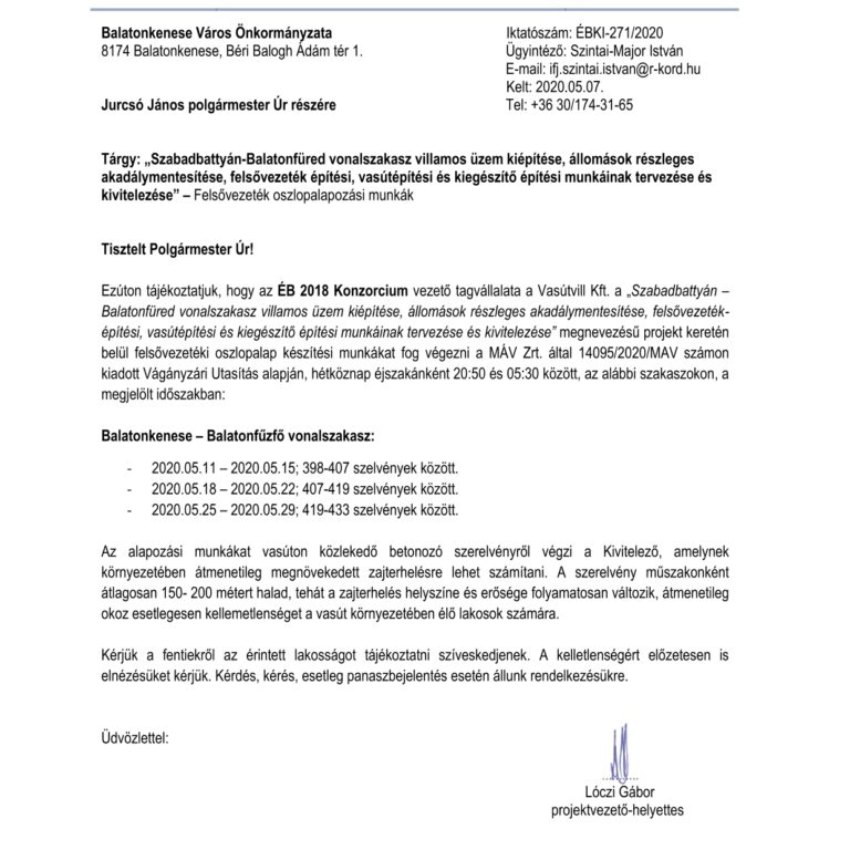 A „Szabadbattyán-Balatonfüred vonalszakasz villamos üzem kiépítése, állomások részleges akadálymentesítése, felsővezeték építési, vasútépítési és kiegészítő építési munkáinak tervezése és kivitelezése” megnevezésű projekt megvalósításával kapcsolatban az alábbi tájékoztatás érkezett önkormányzatunkhoz: „Az ÉB…