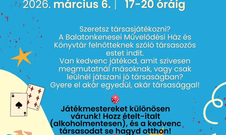 Március 6. 17 óra – Kultúra háza – ingyenes program Társas est – Izgalmas társasjáték partira várunk minden érdeklődőket, fiatalokat és régebb óta fiatalokat, játékmestereket és játékosokat! Ismét egy jó…