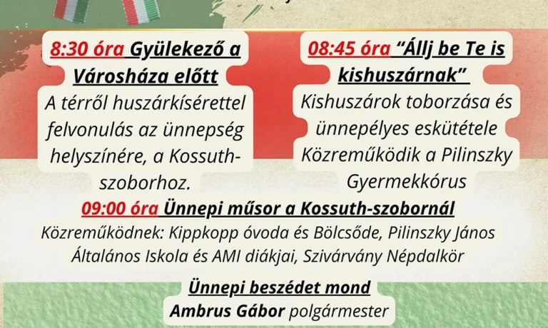 Március 15-én, 8:30 órától – Kossuth-tér Március 15 – Ünnepi megemlékezés, kis huszárok toborzása, eskütétele. Ünnepeljünk közösen!