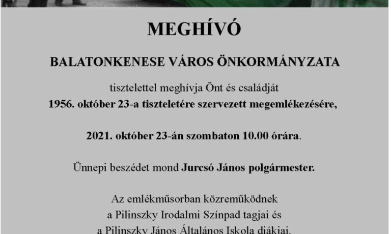 Balatonkenese Város Önkormányzata és a Közművelődési Intézmény és Könyvtár tisztelettel meghívja Önt és családját 1956. október 23-a tiszteletére tartandó megemlékezésre és koszorúzásra 2021. október 23-án 10.00 órakor a Bakó ligetbe.…