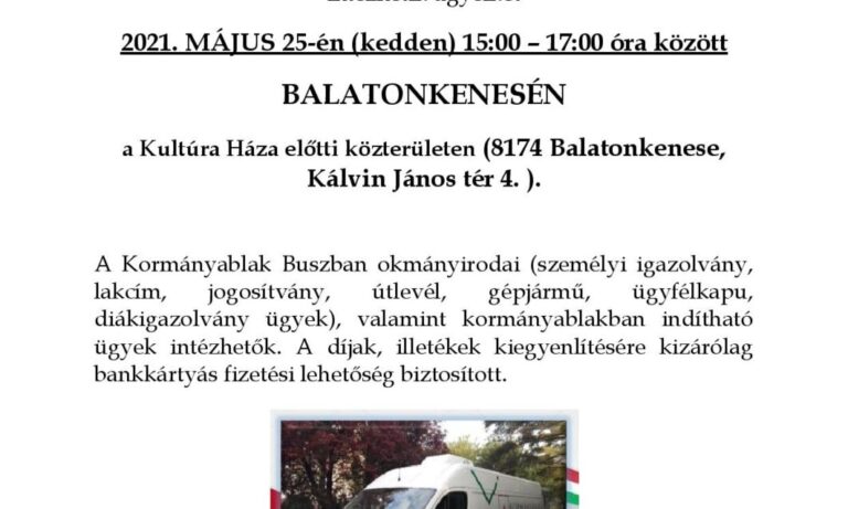 2021. május 25-én 15:00-17:00 óra között az érintettek a Kultúra Háza parkolójában álló Kormányablak buszban (mobil ügyfélszolgálat) intézhetik ügyeiket.