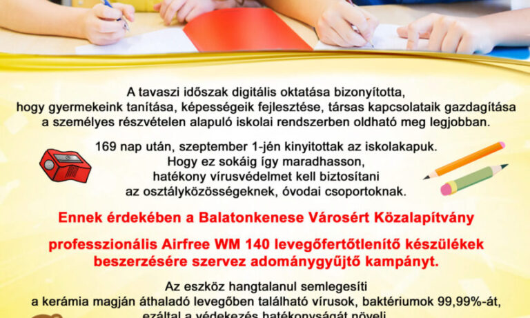 Balatonkenese Városért Közalapítvány adománygyűjtő kampányt szervez. Az adománygyűjtés célja, hogy a Közalapítvány légfertőtlenítő készülékeket tudjon vásárolni az Iskola, Óvoda és Bölcsőde részére. Kérjük és várjuk megtisztelő adományaikat az Alapítvány számlájára:…