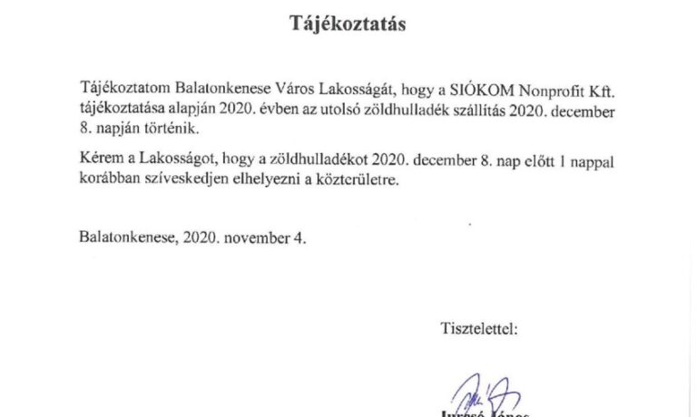 Tájékoztatjuk a Tisztelt Lakosságot, hogy a SIÓKOM 2020. évben utoljára december 8-án szállítja el a zöldhulladékot, melyet a szállítás előtt 1 nappal korábban kell kihelyezni a közterületre.