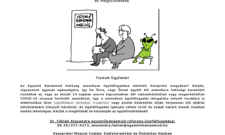 Az Egyenlő Bánásmód Hatóság személyes ügyfélfogadása elérhető Veszprém megyében! Dr. Fábián Alexandra egyenlőbánásmód-referens ügyfélfogadása: 06 30/377-4272, alexandra.fabian@egyenlobanasmod.hu Veszprém Megyei Család, Esélyteremtési és Önkéntes Házban (8200 Veszprém, Kossuth u.…