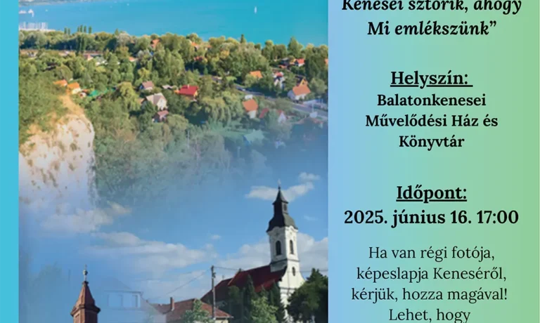 Érdekes gondolatok a múltról – a Balatonkenesei Testvérvárosok Közösségének szervezésében kötetlen beszélgetések zajlanak majd érdeklődésre számot tartó közéleti eseményekről, történésekről, véleményekről.
