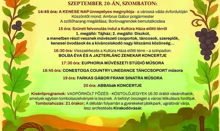 Ismét újabb, színes közösségi eseményre készülünk! Kérjük a jelentkezéseket a vadpörkölt főzésre és várunk mindenkit a szüreti felvonulással kiegészített, hagyományos KENESE- NAPRA!