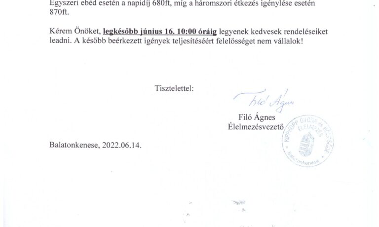 Tájékoztatjuk Önöket, hogy a nyári felügyeletet igénylő iskolások részére elérhető az étkezés 2022. június 20. és 2022. június 30. között. Rendelés leadási határidő: 2022. június 16.
