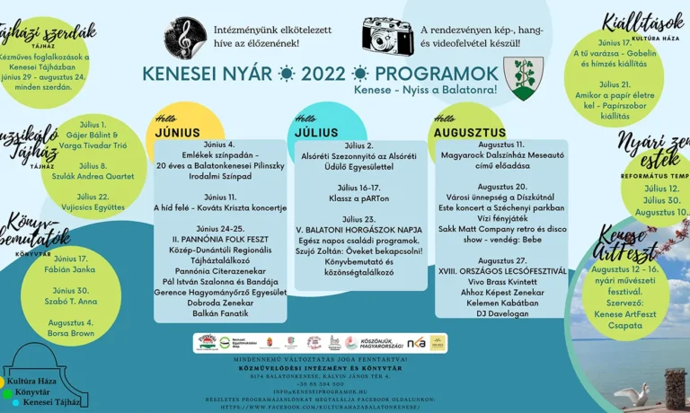 Sok szeretettel várunk minden kedves Balatonkeneseit, Balatonkenesén Nyaralót, Átutazót, Szomszédot, Érdeklődőt rendezvényeinken. A rendezvényekhez bármilyen formában hozzájáruló Partnereinknek ezúton is köszönjük az együttműködést, a közreműködést, a közös munkát, a támogatást!…