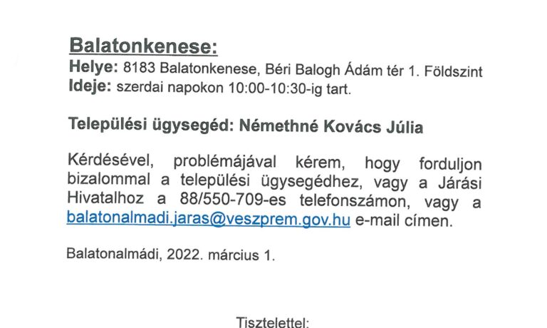 Települési ügysegéd A települési ügysegéd ügyfélfogadása 2022. március 1. naptól szerdai napokon 10:00-10:30 között a Balatonkenesei Polgármesteri Hivatalban újra rendelkezésre áll.