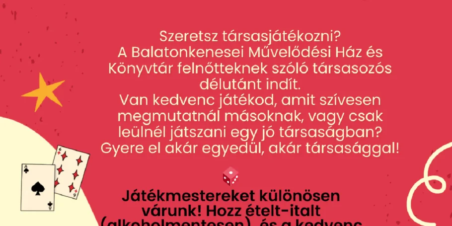 Kocka, kóla, kikapcs…Társasjátékozni még a felnőttek is szeretnek! Várunk február 6-án délután, ha vágysz egy kis közösségre és szívesen játszol együtt másokkal!