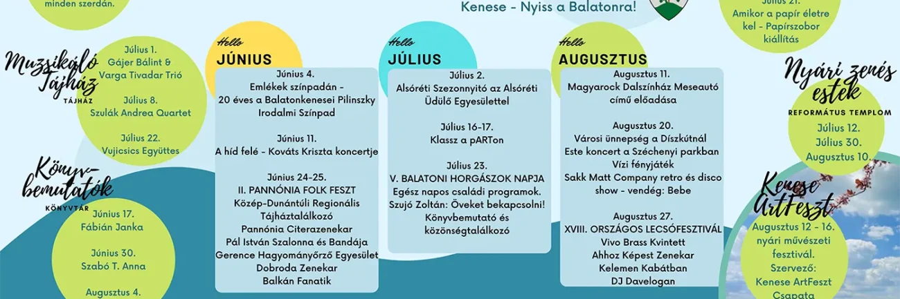 Sok szeretettel várunk minden kedves Balatonkeneseit, Balatonkenesén Nyaralót, Átutazót, Szomszédot, Érdeklődőt rendezvényeinken. A rendezvényekhez bármilyen formában hozzájáruló Partnereinknek ezúton is köszönjük az együttműködést, a közreműködést, a közös munkát, a támogatást!…