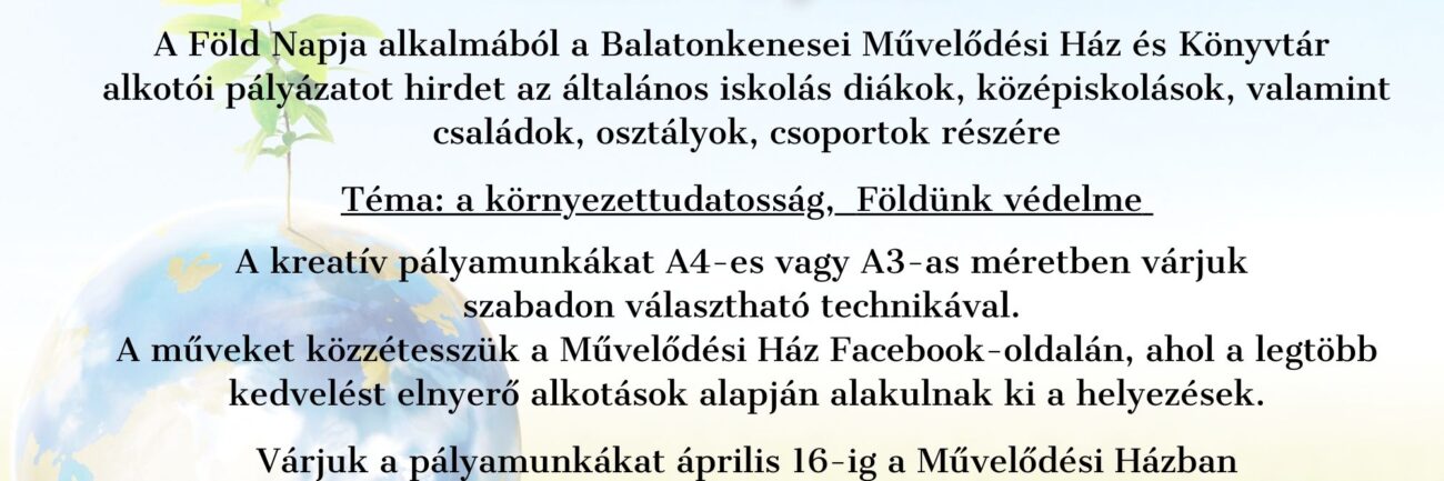 A Balatonkenesei Művelődési Ház és Könyvtár alkotói pályázatot hirdet a Föld Napja alkalmából! Várjuk az általános iskolásokat, középiskolásokat, valamint családok, osztályok és baráti csoportok kreatív munkáit! Téma: Környezettudatosság, Földünk védelme…