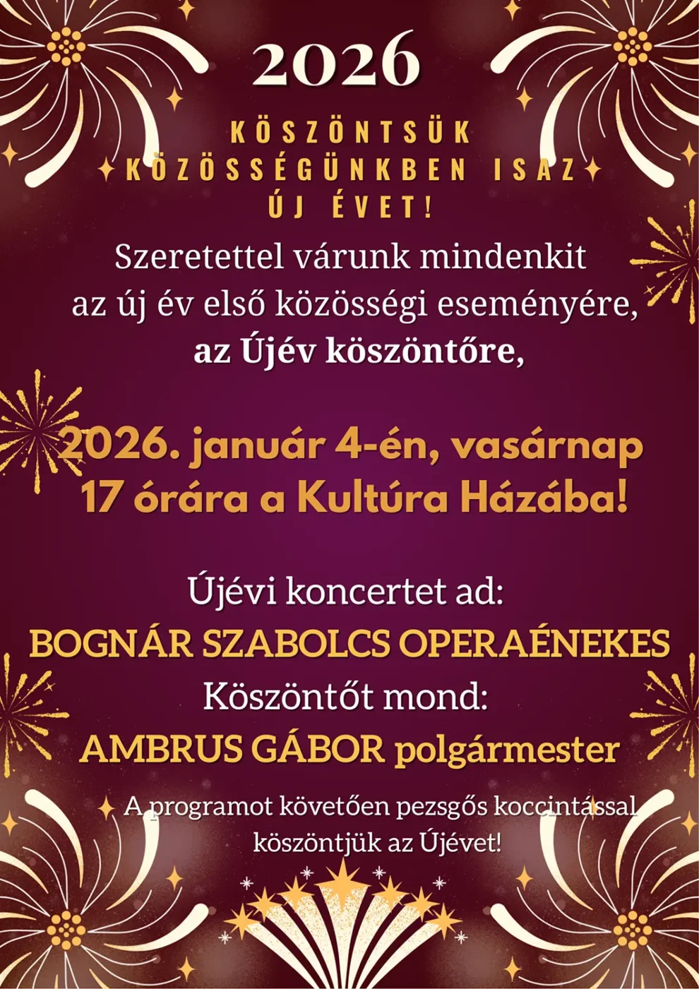 Operaáriák színesítik 2026. első közösségi összejövetelét, az ÚJÉvKöszöntőt! Koccintsunk együtt az új évre! 2026. január 4. vasárnap 17 óra Helyszín: Kultúra Háza ingyenes rendezvény