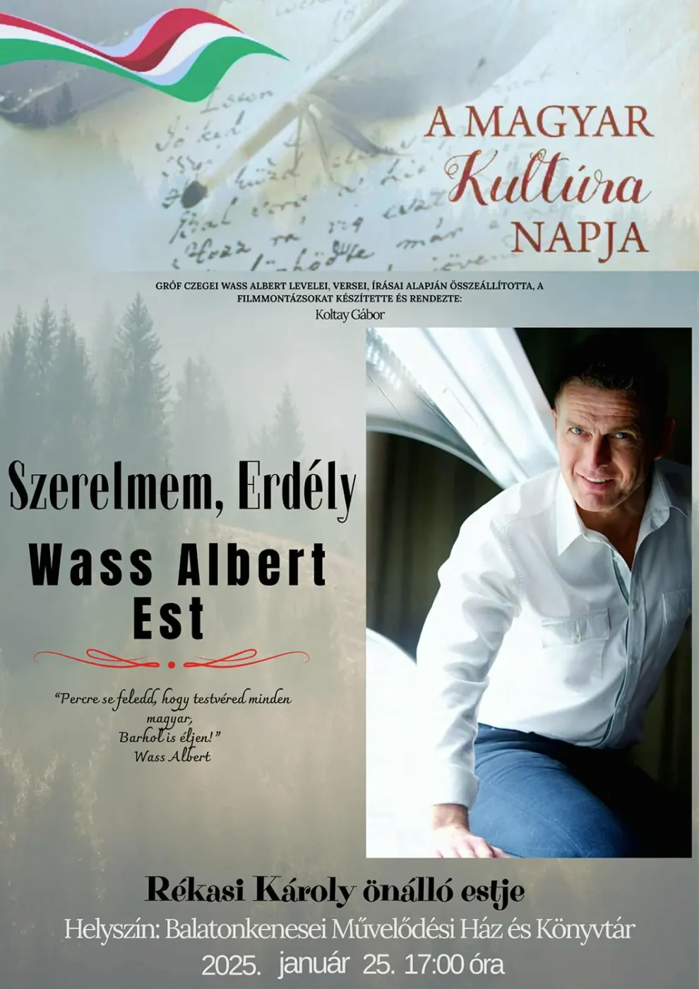 A Magyar Kultúra Napján átadjuk a Balatonkenese Jövőjéért és a Balatonkenese Kultúrájáért Díjakat. Ajándékműsorként pedig Rékasi Károly színművész lesz a vendégünk különleges, erdélyi ősszeállításával. 2026. január 25. vasárnap 17 óra…