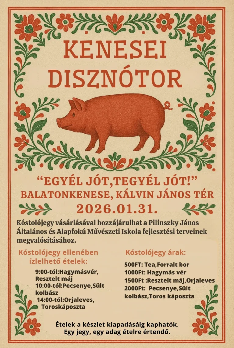 Ismét megrendezzük a hagyományos disznóvágást a Kultúra Háza előtti téren a Balatonkenesei Városvédő Egyesülettel közreműködve. A program jótékony célt szolgál, tehát a finom falatok megvásárlásával segítünk is! Várunk mindenkit szeretettel!