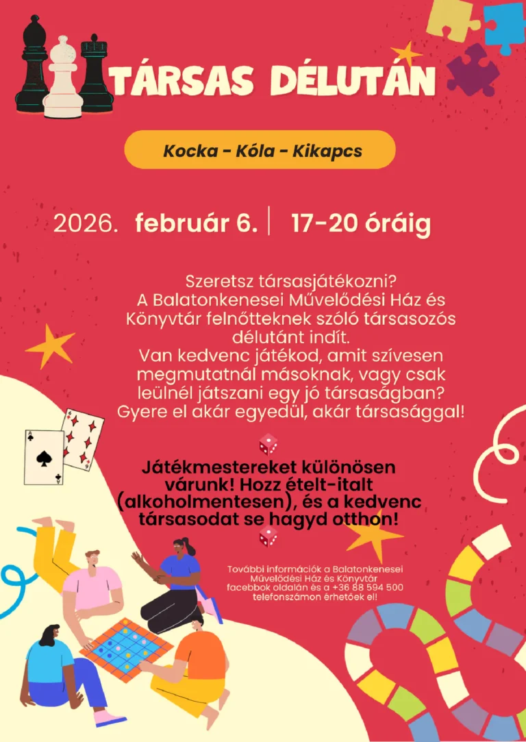 Kocka, kóla, kikapcs…Társasjátékozni még a felnőttek is szeretnek! Várunk február 6-án délután, ha vágysz egy kis közösségre és szívesen játszol együtt másokkal!