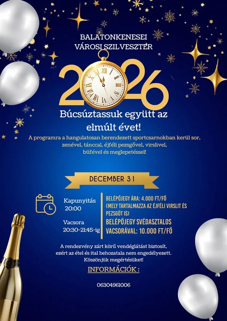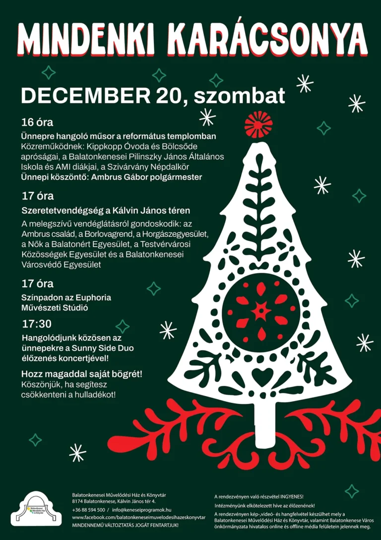 A Magyar Kultúra Napján átadjuk a Balatonkenese Jövőjéért és a Balatonkenese Kultúrájáért Díjakat. Ajándékműsorként pedig Rékasi Károly színművész lesz a vendégünk különleges, erdélyi ősszeállításával. 2026. január 25. vasárnap 17 óra…