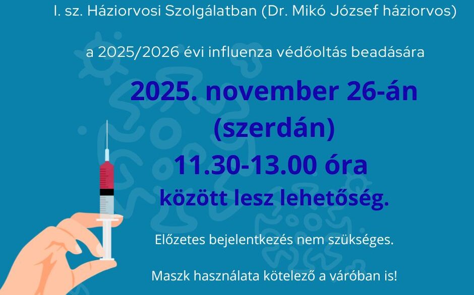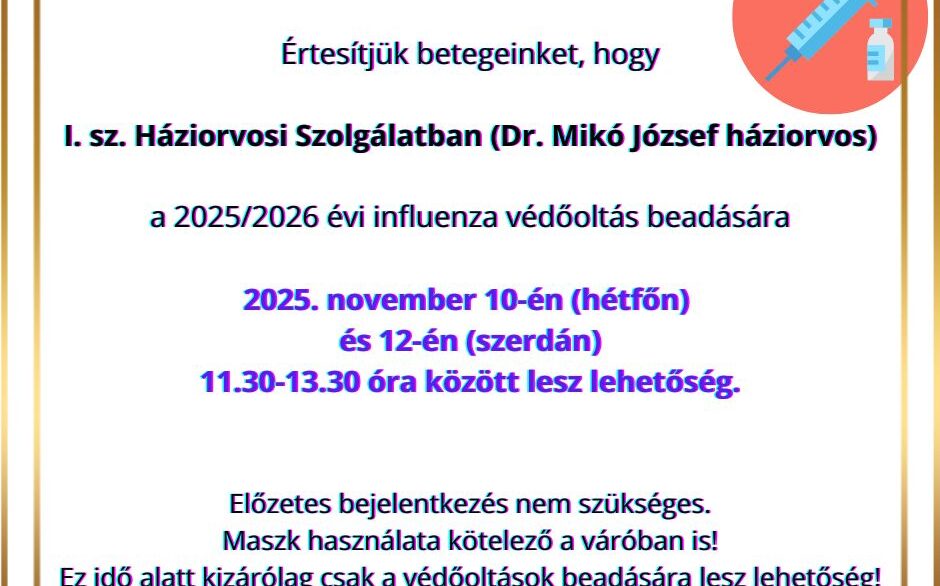 Értesítjük betegeinket, hogy I. sz. Háziorvosi Szolgálatban (Dr. Mikó József háziorvos) a 2025/2026 évi influenza védőoltás beadására 2025. november 10-én…