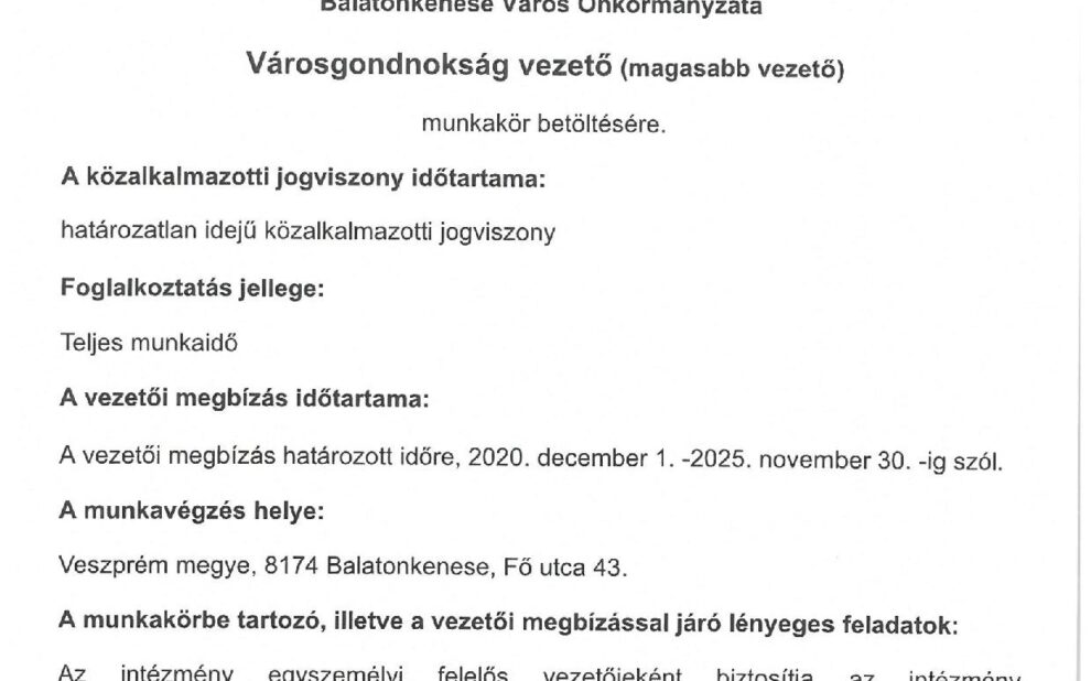 Balatonkenese Város Önkormányzata Pályázatot hirdet Városgondnokság vezető munkakör betöltésére. A pályázat benyújtásának határideje: november 9.