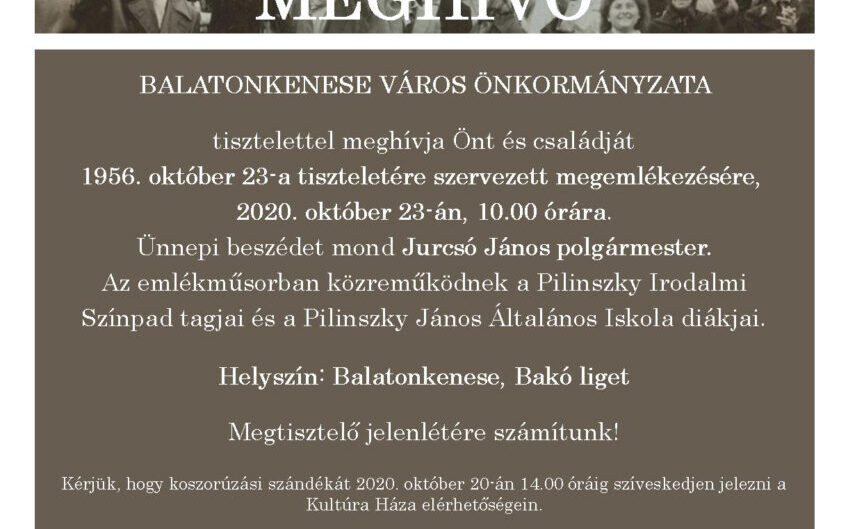 Balatonkenese Város Önkormányzata tisztelettel meghívja önt és családját 1956. október 23-a tiszteletére szervezett megemlékezésére, 2020. október 23-án, 10.00 órára. Ünnepi…