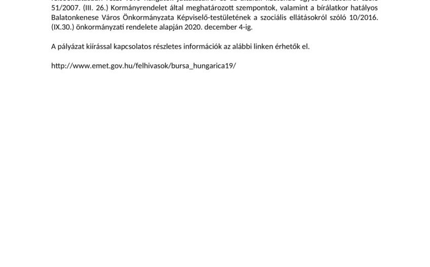 Balatonkenese Város Önkormányzata az Emberi Erőforrások Minisztériumával együttműködve kiírja 2021. évre a Bursa Hungarica Felsőoktatási Önkormányzati „A” típusú Ösztöndíjpályázatot felsőoktatási…