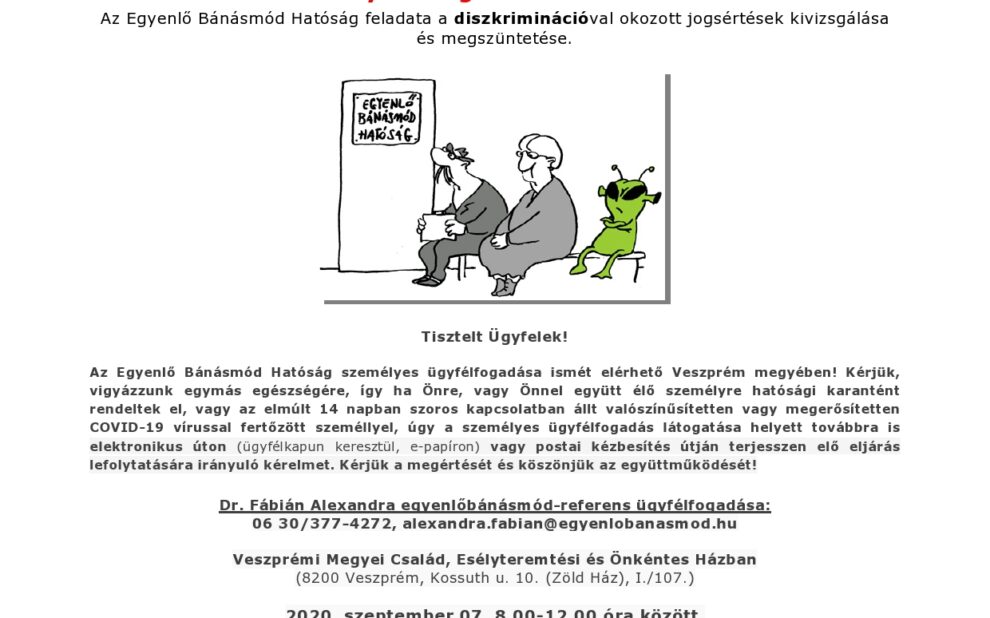 Az Egyenlő Bánásmód Hatóság személyes ügyfélfogadása szeptember hónapban is elérhető Veszprém megyében! Helyszín Veszprémi Megyei Család, Esélyteremtési és Önkéntes Ház…